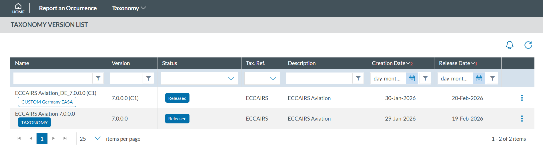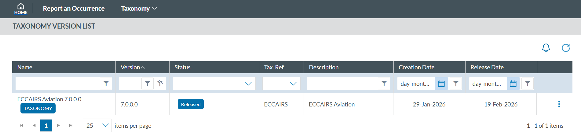 The ECCAIRS2 Taxonomy is publicly available and serves as the standard reference for all Occurrence Reports. Users can access the latest published version without registration. Additionally, Authorities may create custom taxonomies with tailored attributes, entities, or value lists, which require user registration to view.